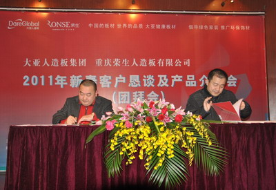本次活动,在互动活跃的气氛中圆满结束,通过精彩的领导发言及新年战略合同的签订,相信大亚人造板集团与重庆荣生人造板有限公司2011年合作会更愉快,发展更强大。希望通过该行业的佼佼者带动整个板材加工市场走向更辉煌的明天。