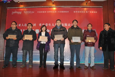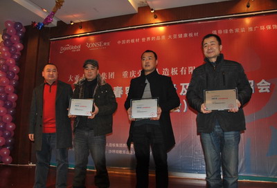 1月6日,大亚人造板集团与重庆荣生人造板有限公司“2011年新春客户恳谈及商品介绍会”以团拜会的议程形式在歌乐山庄园会议厅圆满举行。此次活动邀请到了搜狐家居网、商报、时报等主流媒体。同时也表现出了主办方对此次团拜会的重视,活动现场各地供应商经销商相互分享经验,许多优秀的经销商获得了主办方颁发的荣誉奖杯及奖品。主办方还为前来的宾客准备了丰盛的晚宴,欢快的节目演绎以及精美的礼品等。